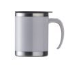 Caneca acrílica 400ml com detalhe oval no pegador, revestimento interno e detalhes em inox. Tampa plástica resistente com sistema giratório para abertura(não é térmica).