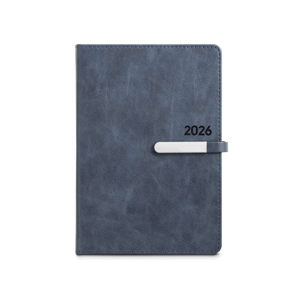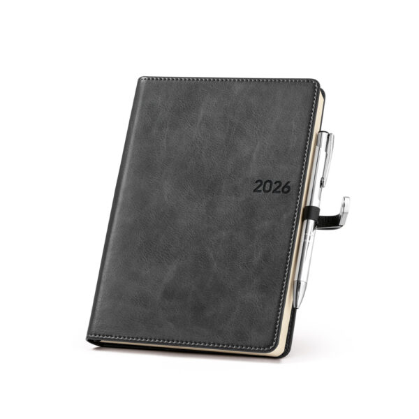 Agenda 2026 A5 em tecido poliéster com suporte para caneta, marcador em fita e plano diário. Prática, resistente e ideal para sua rotina.