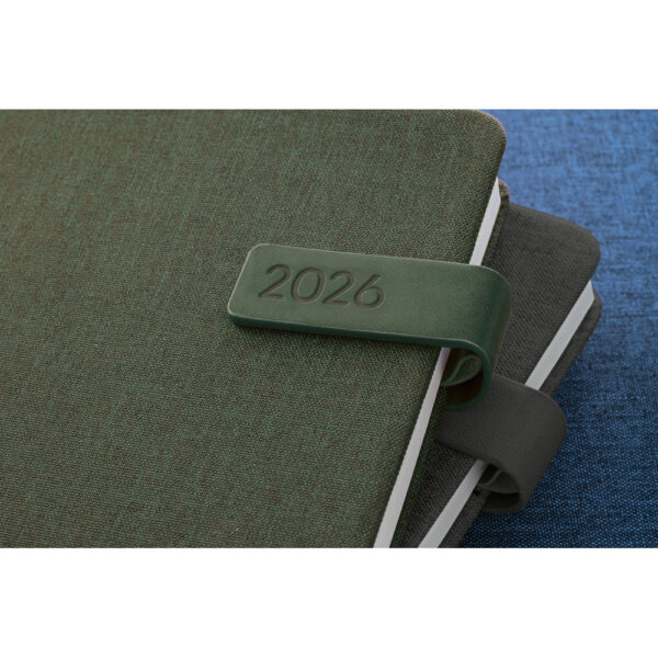 Agenda 2026 A5 em tecido poliéster com suporte para caneta, marcador em fita e plano diário. Prática, resistente e ideal para sua rotina.