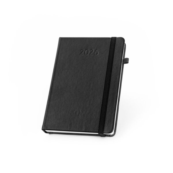 Agenda 2026 A5 em PU à base de água, com suporte para esferográfica (não inclusa), marcador em fita, elástico para fechamento e organização em plano diário.