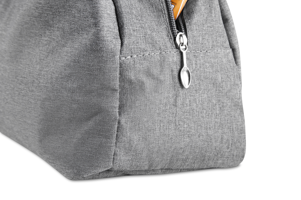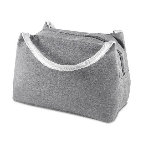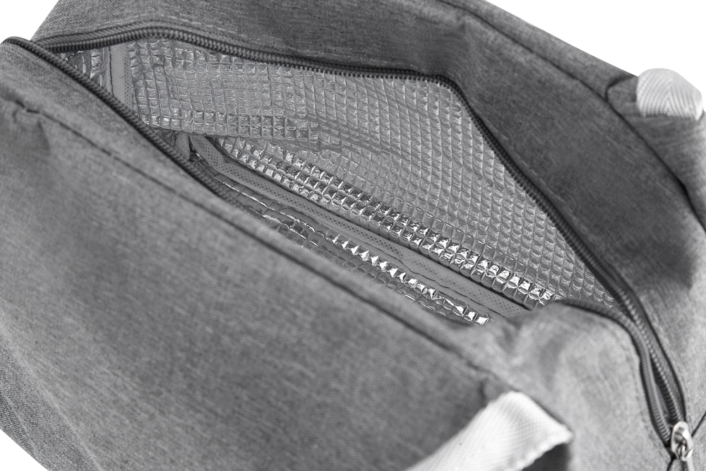 Bolsa térmica costurada em poliéster 300D, com interior em alumínio e manta térmica. Modelo sem solda, possui puxador de zíper em formato de colher e capacidade de 7 litros.