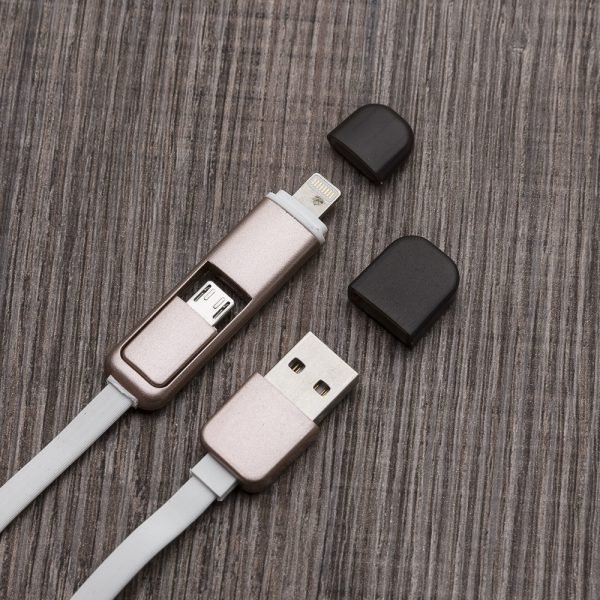 Cabo de dados 2 em 1, compatível com entradas V8/Android e Lightning/iPhone, oferecendo conveniência para diversos dispositivos. Inclui tampas de proteção para garantir durabilidade e prevenir danos quando não estiver em uso. Ideal para manter seus dispositivos carregados e sincronizados com facilidade e segurança.
