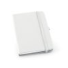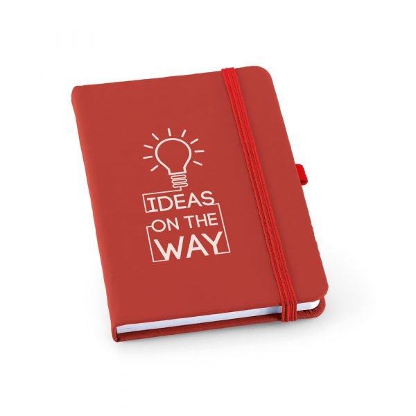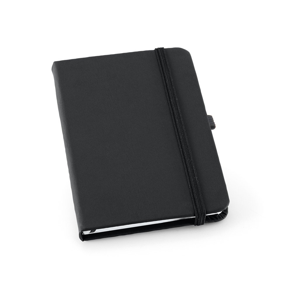 Caderno A6 com capa dura em couro sintético e 80 folhas pautadas. 90 x 140 mm.