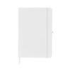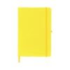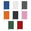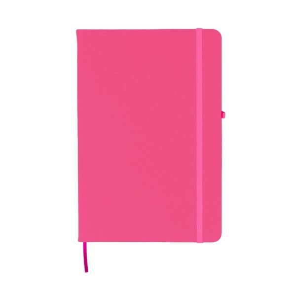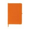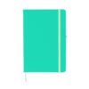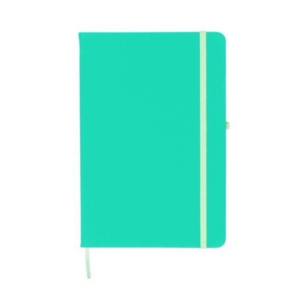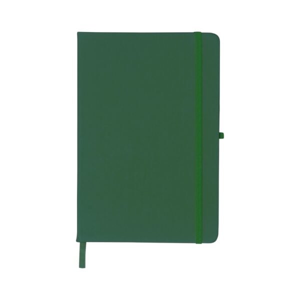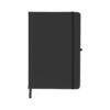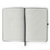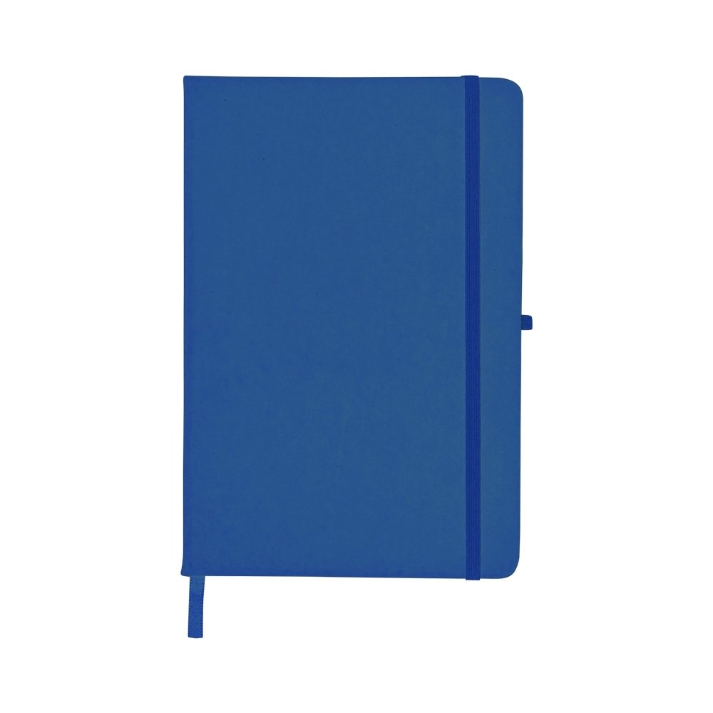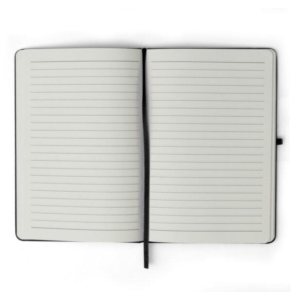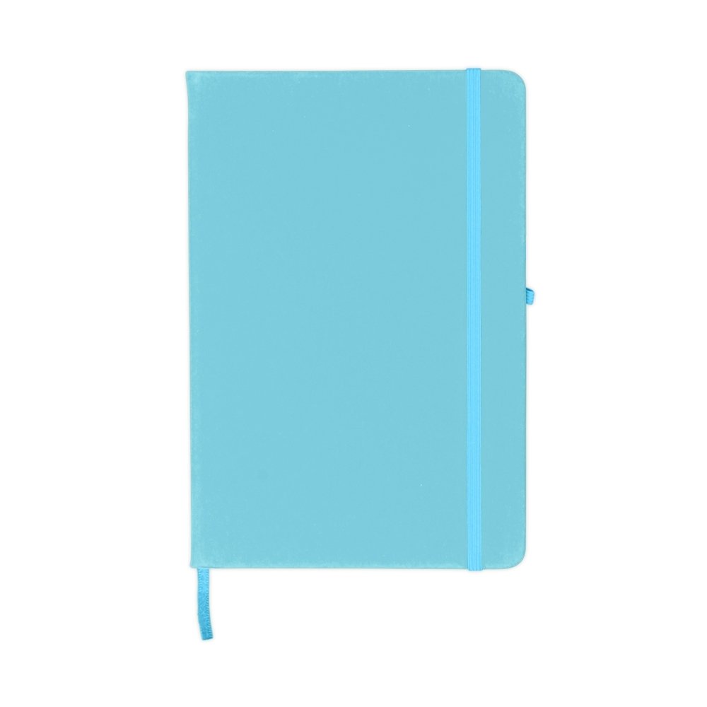 Caderno emborrachado com porta caneta elástico em nylon, marcador de página em cetim e fita elástica de nylon para fechar. Contém aproximadamente 80 folhas pardas pautadas.