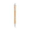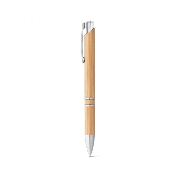 Caneta ecológica de bambu com clipe de metal. Conta com a escrita em tinta azul. Sustentável e elegante. Tamanho: ø1,1 x 14,1 cm