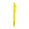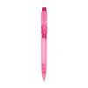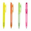 Caneta plástica com carga esferográfica azul e acionamento por clique.