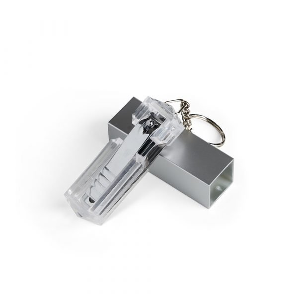 Chaveiro kit manicure de 4 peças em estojo plástico. Possui lixa, pinça, empurrador de cutícula e cortador de unha preso. Estojo com berço plástico para acomodação das peças.