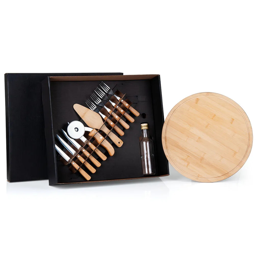 Conjunto para Pizza em Bambu/Aço Inox. Acompanha tábua e espátula em Bambu; quatro facas de mesa, quatro garfos de mesa e cortador de Pizza em Bambu/Inox; garrafa com tampa.