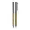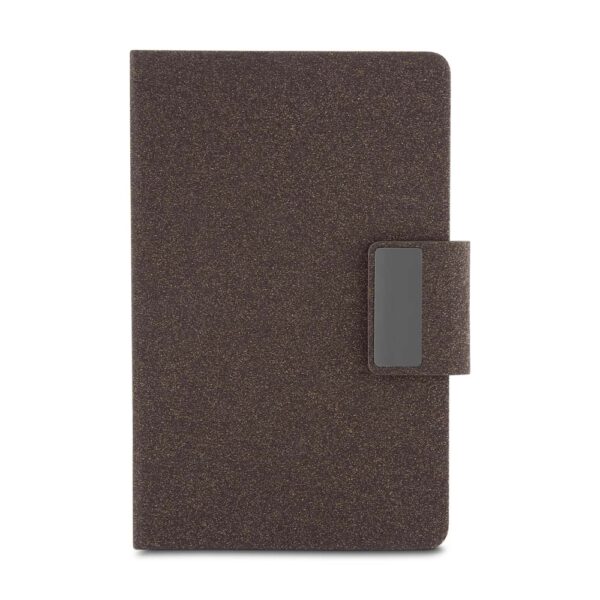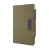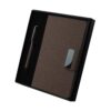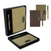 Kit de escritório com caderno A5 em PU e fibra de chá ou café, 80 folhas pautadas 70g/m², caneta metálica combinando e estojo preto, ideal para brindes corporativos elegantes de alto padrão premium.