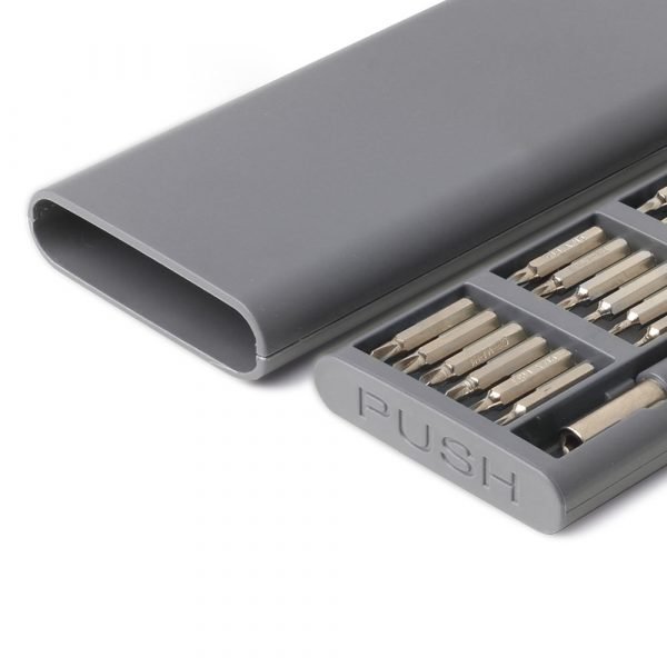 Kit ferramentas, feito em plástico ABS, com 24 pontas de aço inox e chave manual para encaixe e manuseio, ideal para reparos domésticos e profissionais.