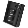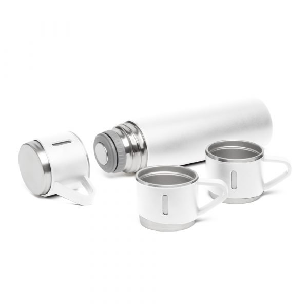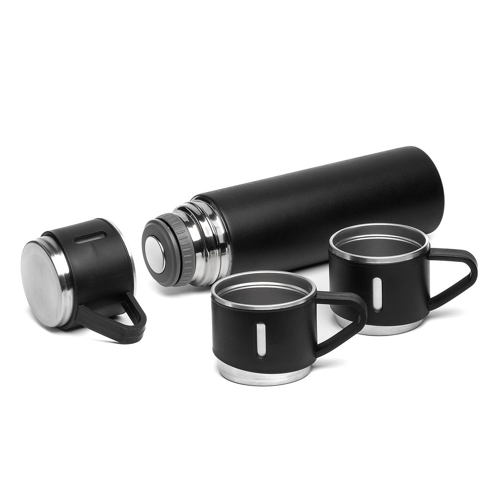 Kit Garrafa e copo. Inclui garrafa térmica de 500ml em aço inox com parede dupla isolada a vácuo e três canecas de 100ml. Embalagem em caixa e sacola preta.