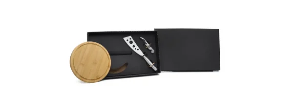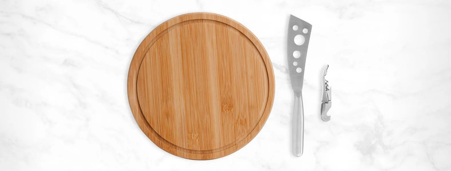 Kit para queijo e vinho. Inclui tábua redonda para queijo e petiscos, faca em inox para queijo, abridor saca rolhas em aço inox escovado. Pratico e elegante para ocasiões especiais.