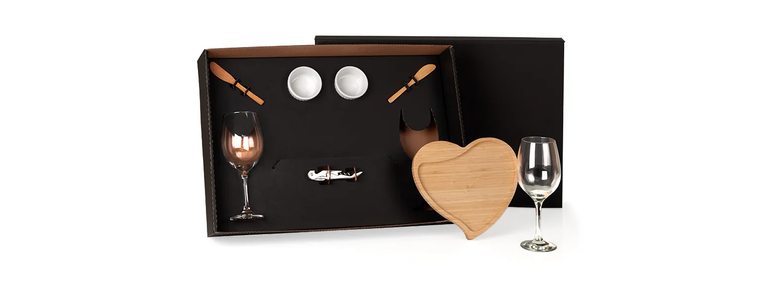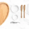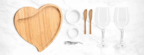 Kit para Petisco e Vinho. Inclui petisqueira em formato de coração, duas espátulas em bambu, dois ramekins de porcelana, duas taças de vidro e um abridor de metal. Vem em caixa presente.