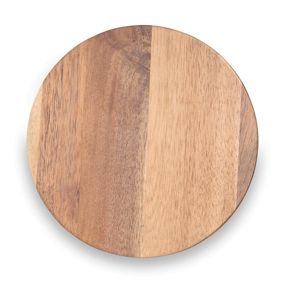 Kit queijo 3 peças em estojo kraft, contém: tábua de madeira redonda, faca com ponta, e faca vazada com ponta. Tábua com orifício para encaixe.