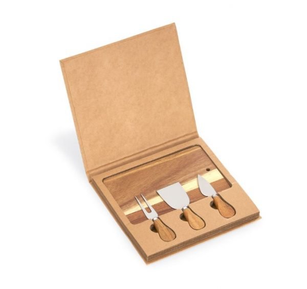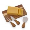 Kit Queijo com 04 peças: Faca, Garfo, Espatula e Tábua de madeira retangular com espessura de 1cm