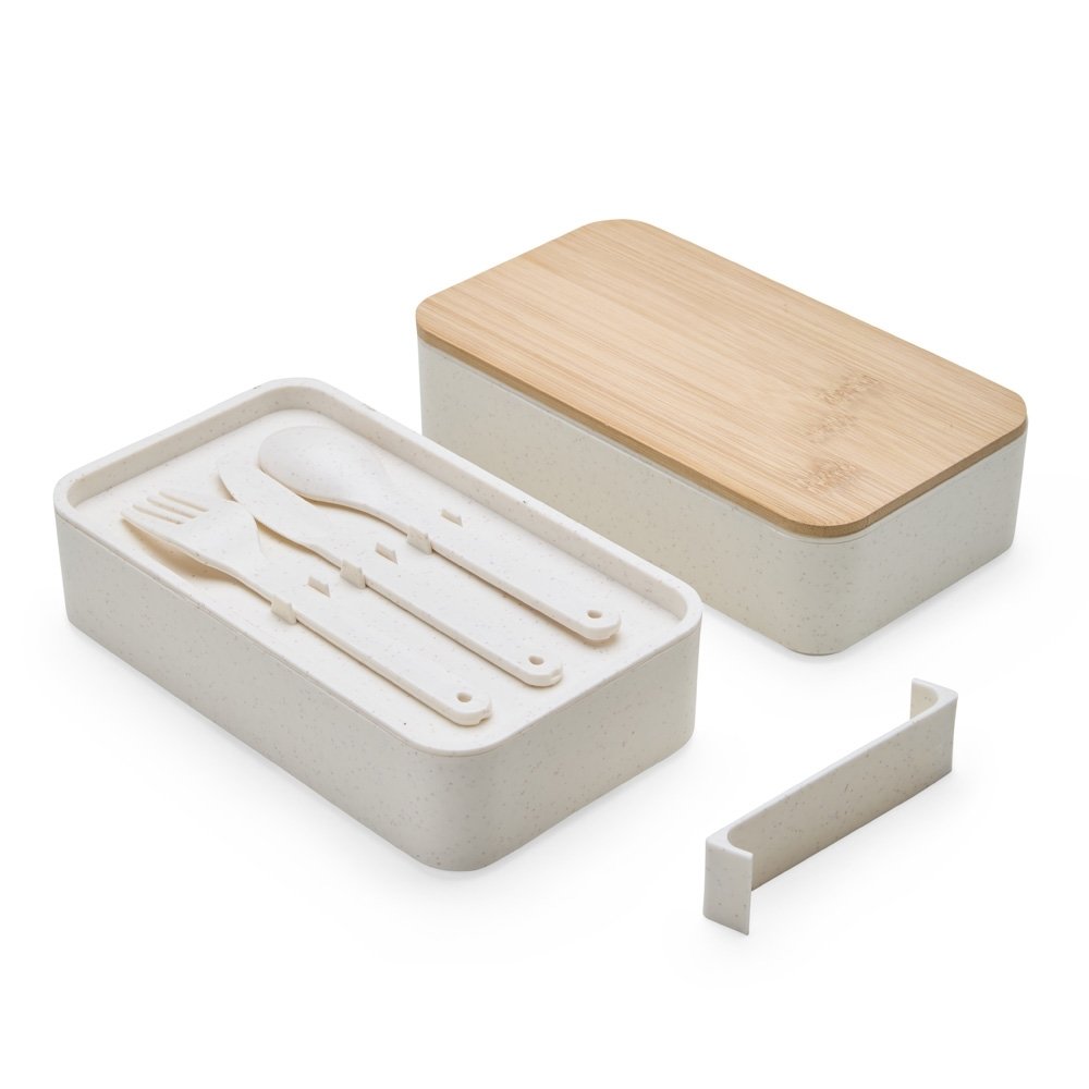 Marmita dupla em Fibra de Trigo com 600ml e 500ml, tampa de bambu, talheres, divisória removível e elástico para transporte seguro.
