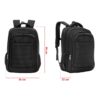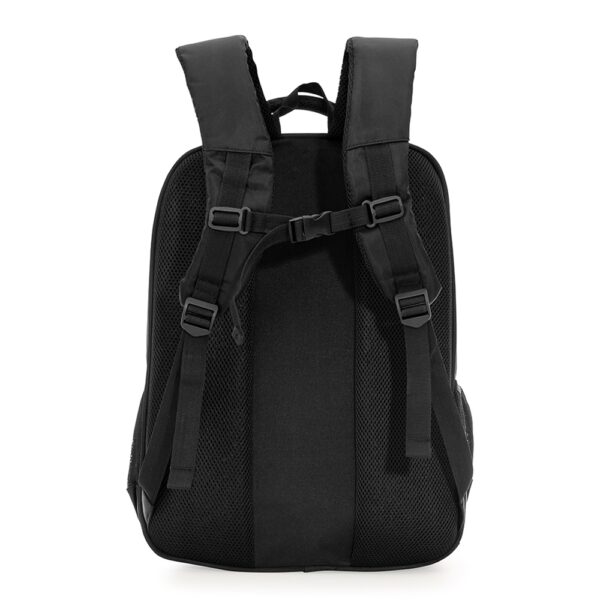 Mochila em poliéster de 27 litros com três compartimentos, bolso para notebook 15,6”, divisórias internas, bolsos laterais em malha, alças de mão, alça de compensação e costas com revestimento espumado.