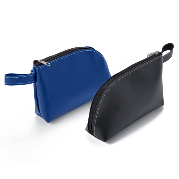Nécessaire em PU com forro sintético Bidim e alça lateral. Personalizável com gravação frontal em serigrafia ou plaquinha. Elegante e funcional.