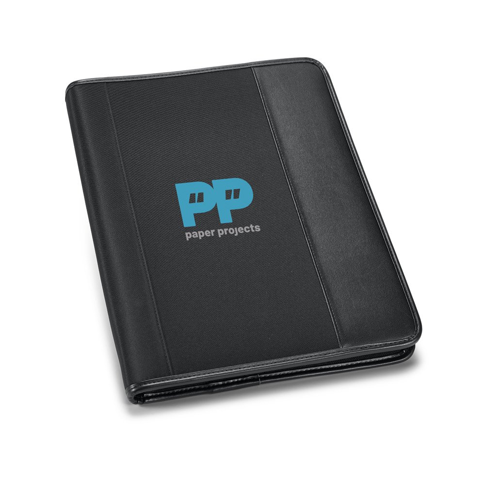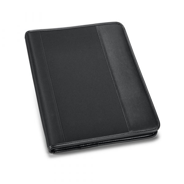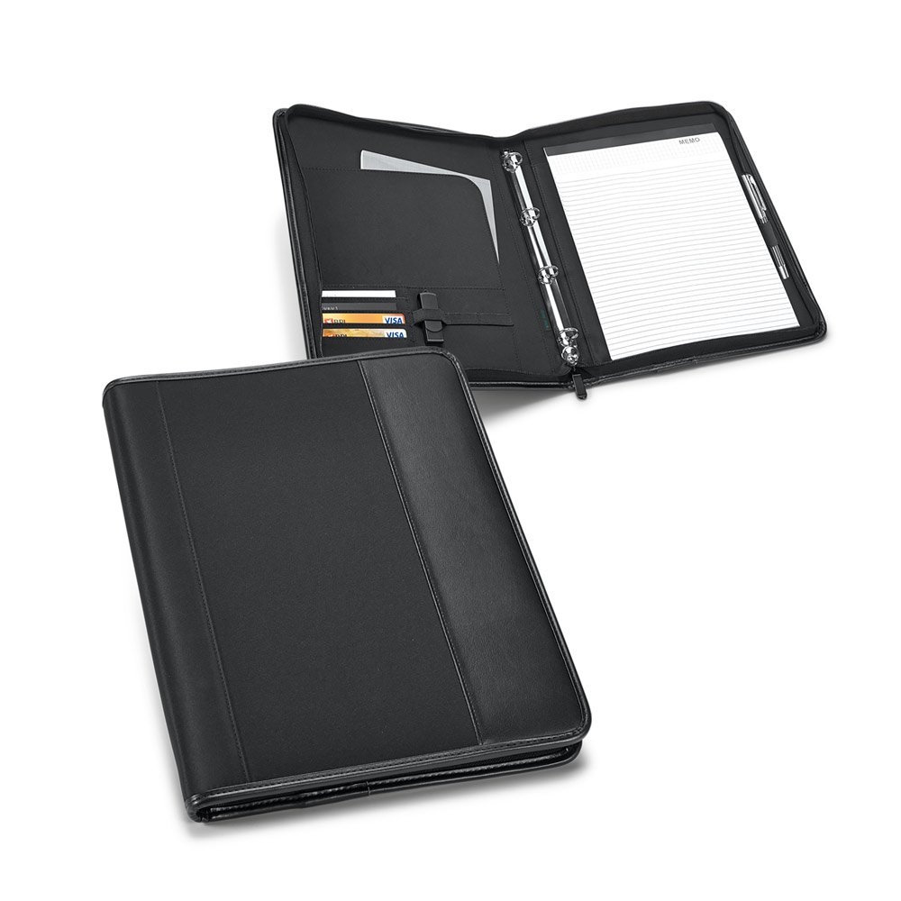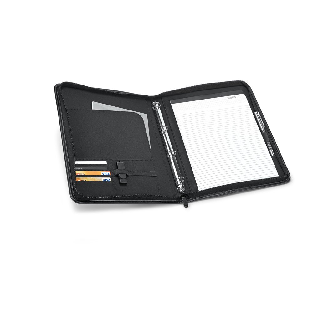 Pasta A4 em c. sintético e microfibra com 4 argolas de 20 mm e caderno com 20 folhas pautadas. Pen drive não inclusa
